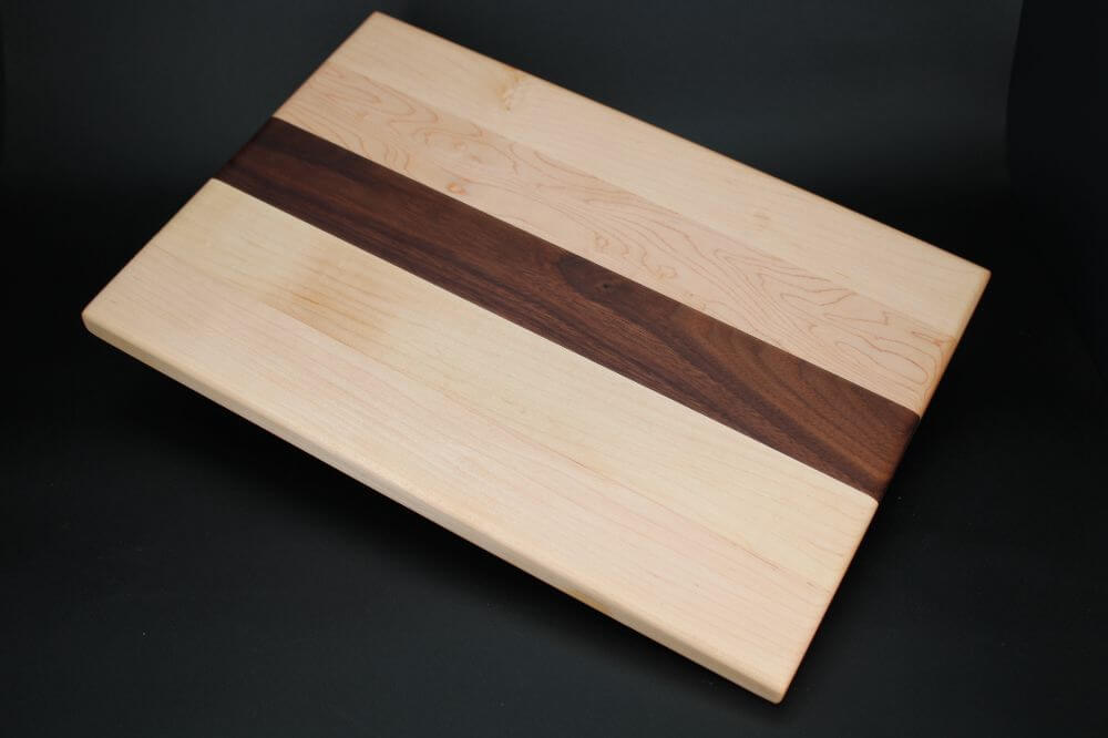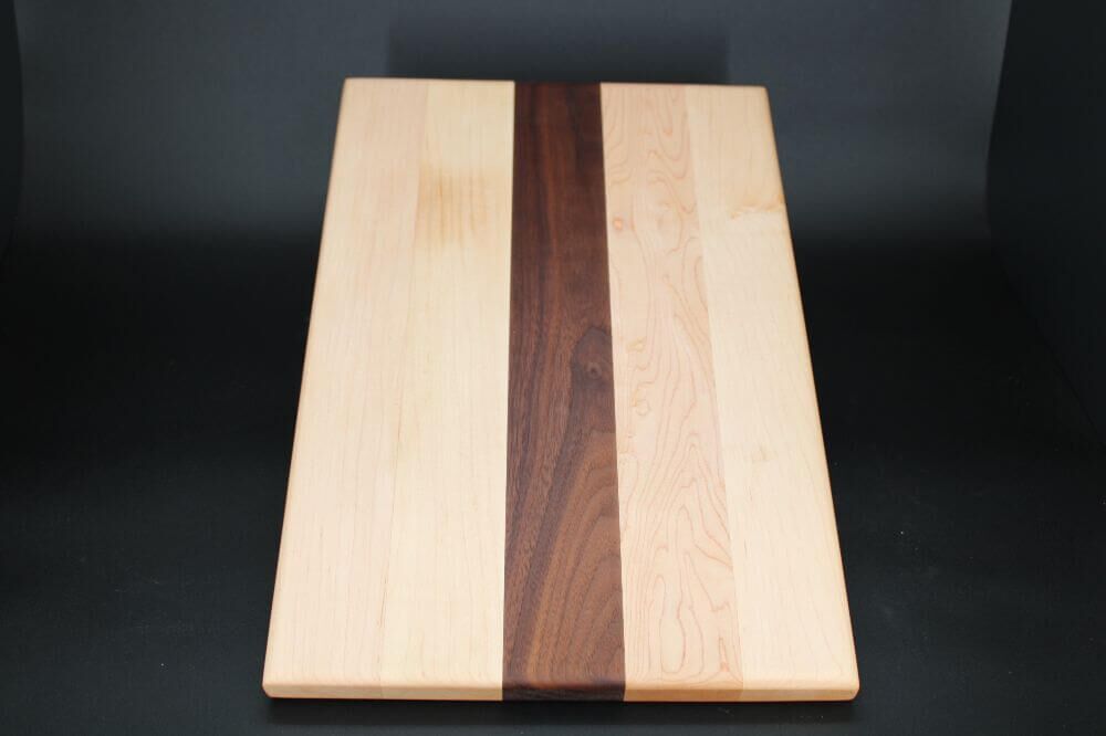 The MMWMM maple and walnut board is crafted from a beautiful blend of light maple and rich walnut. It showcases a striking contrast between the predominantly light maple board and the focal, a center stripe of deep-toned walnut wood.